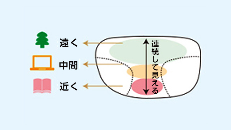 1つのレンズに焦点が多数あるレンズです。「遠近両用レンズ」に代表される、1 つのメガネで掛け替えることなく遠くと近くを見ることができるレンズです。