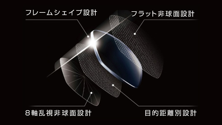 従来からある「球面設計」、ゆがみを減らしレンズの厚みを薄くする「非球面設計」、さらに性能・薄さを向上させた「両面非球面設計」、よりカスタマイズされたオーダーメイド非球面設計があります。