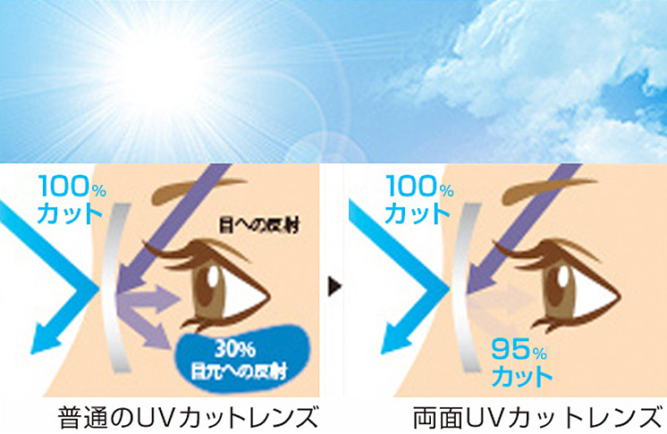 さらに紫外線対策を強化したい場合には、レンズ裏面に反射する紫外線をカットするワンランク上のUV対策コーティング<両面UVカットレンズ>があります。