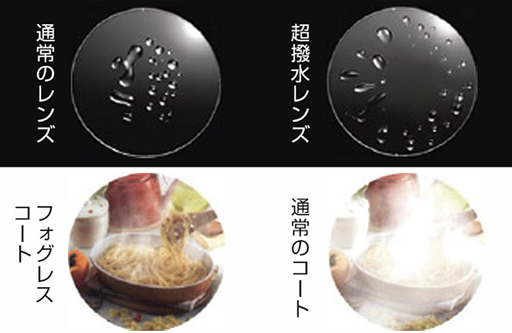 防曇コート加工は、マスクや食事の湯気などによるレンズのくもりを防げます。